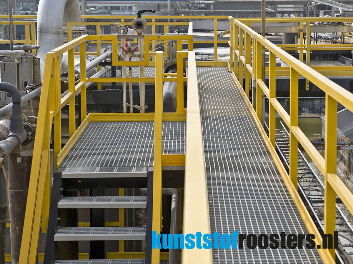 Glasvezel Versterkte Kunststof roosters en traptreden zijn corrosiebestendig, sterk, licht in gewicht, onderhoudsarm, veilig en eenvoudig te monteren. GVK is daarom een uitstekend constructiemateriaal voor gebruik in waterrijke, corrosie gevoelige en chemisch agressieve omgevingen.